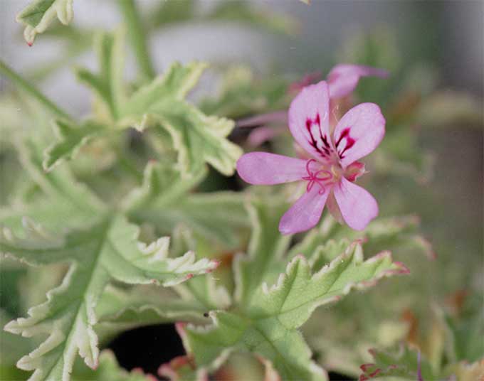 レディプリマスゼラニウムは、葉の周りに美しい斑が入り、花の時期だけでなく、年中目を楽しませてくれるゼラニウムです。甘いローズの香りの葉で、ニオイゼラニウムの中でも人気の品種です。