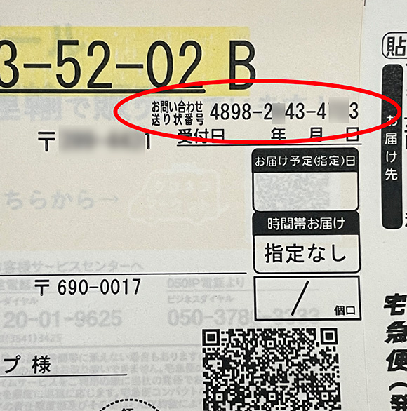箱についているクロネコヤマトの伝票をご確認ください。12桁の「お問い合わせ送り状番号」というのがございます。(例:1234-5678-9012)